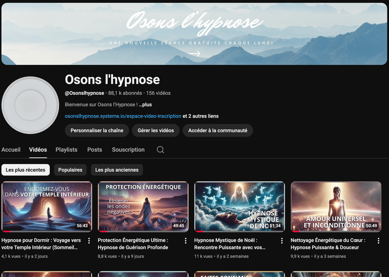 Chaque semaine, je publie des séances guidées offertes d'hypnose ou de méditation. Actuellement, la chaine est suivie par plusieurs dizaines de milliers de personnes et compte près de 4 millions de vues.